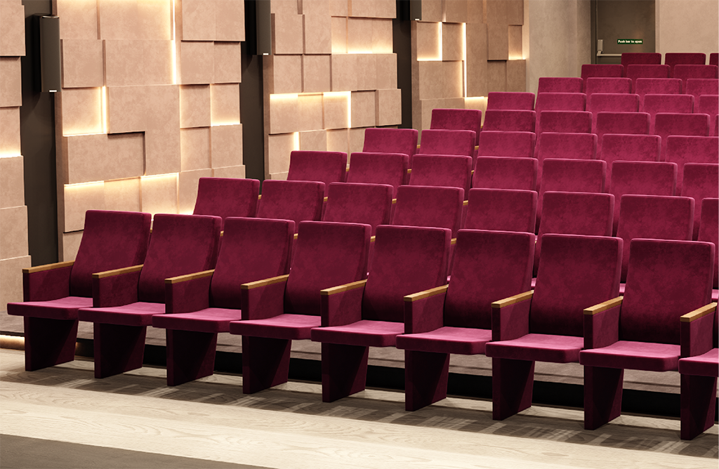 Ключевая особенность секции Grid — анатомически выверенная форма сиденья и спинки, разработанная с учётом эргономики посадки и реализованная за счёт сложной геометрии деревянного каркаса и многослойного пенополиуретанового настила. Сиденье оснащено возвратным механизмом и откидывается к спинке, освобождая проходы и упрощая эксплуатацию зала, а наборная конструкция позволяет точно настроить количество мест под конкретную планировку. Подлокотники с накладками из массива бука добавляют тактильный акцент и подчёркивают статусность решения.